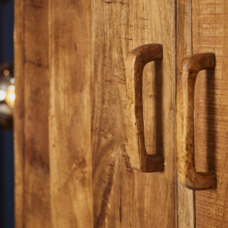 Deze boekenkast is volledig uitgevoerd in mangohout. Dit model is voorzien van twee lades en twee deur. De kast is ingelegd met verschillende stroken gelakt hout, waar het meubel zijn eigentijdse karakter aan te danken heeft.